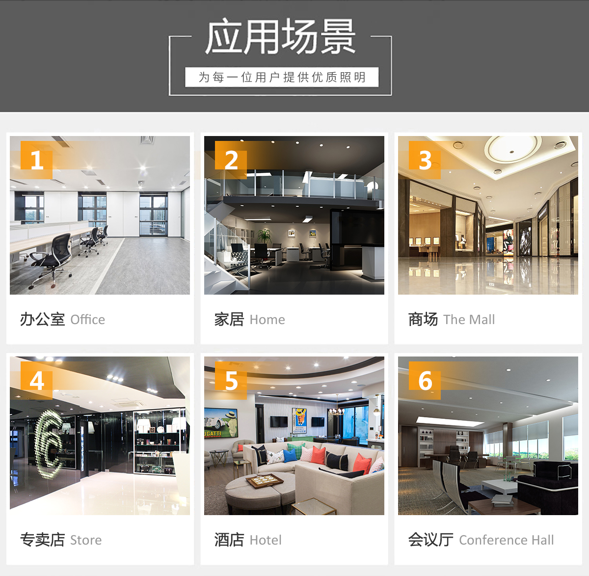 LED筒燈是一種嵌入到天花板內(nèi)光線下射式的照明燈具,光束角屬于廣角度,光線較分散均勻。LED筒燈不占據(jù)室內(nèi)空間,在室內(nèi)安裝LED筒燈,因?yàn)闊艟叩碾[密性,不會(huì)使用產(chǎn)生壓迫的感覺,相反地會(huì)產(chǎn)生溫馨的效果。 旅館、酒店、賓館的照明運(yùn)用LED筒燈等產(chǎn)品,給顧客帶來一種不一樣的感受,除了節(jié)約能源之外,還能盡顯豪華和溫馨。 起居室和家庭影院照明,利用LED筒燈的燈光色彩來烘托一種溫暖、和諧的情調(diào),體現(xiàn)舒適、休閑的氛圍。 博物館、美術(shù)陳列館等場所屬于對照明環(huán)境要求較高的特殊場合,其展示物品的特殊性要求照明光源不含紫外線,沒有熱輻射。LED筒燈是冷光源,光線中不含紫外線,完全可以滿足博物館、美術(shù)陳列館對照明的特殊要求。 會(huì)議室、多功能廳照明可以依據(jù)會(huì)議內(nèi)容的不同調(diào)整會(huì)議室或多功能廳的照明環(huán)境,嚴(yán)肅或是活潑可以自由設(shè)定,LED筒燈可以滿足不同會(huì)議主題對光環(huán)境的需求。 專賣店、商場等室內(nèi)商業(yè)氣氛照明,LED筒燈很適合烘托專賣店和商場的氣氛,LED光源能營造出其他傳統(tǒng)照明電光源所無法比擬的高品質(zhì)光環(huán)境。 其它室內(nèi)照明場所。